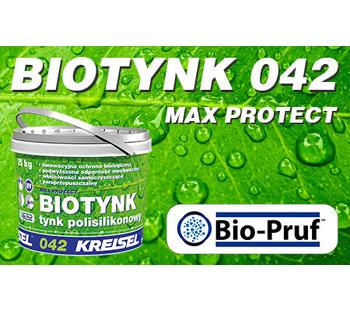 Dzięki zastosowaniu niepowtarzalnego systemu BIO-PRUF, tynk ten charakteryzuje się najwyższą w swojej klasie odpornością na działanie agresji biologicznej. Innowacyjny system uwalnia biocyd w zdecydowanie dłuższym okresie, niż w tradycyjnych rozwiązaniach. Przez to Biotynk Max Protect 042 jest kilkukrotnie bardziej odporny na algi, glony czy grzyby pleśniowe.