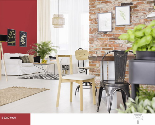 Decydując się na bordową farbę, nie musisz malować nią całego pomieszczenia. Ten kolor jest wprost stworzony, by być "kropką nad i", czy "wisienką na torcie" wnętrza. Funkcjonując jako kolorystyczny akcent na jednej ze ścian w stonowanym pokoju, sam w sobie staje się dekoracją. Idealnie pasuje do pomieszczeń utrzymanych w ciepłej palecie barwnej, w której bazę stanowią beże i ciepłe biele. Cegła, naturalne materiały, jak drewno, czy wiklina oraz czarne detale to idealni towarzysze koloru bordowego. My wybraliśmy odcień S 1080-Y90R lateksowej farby Śnieżka Perfekt.