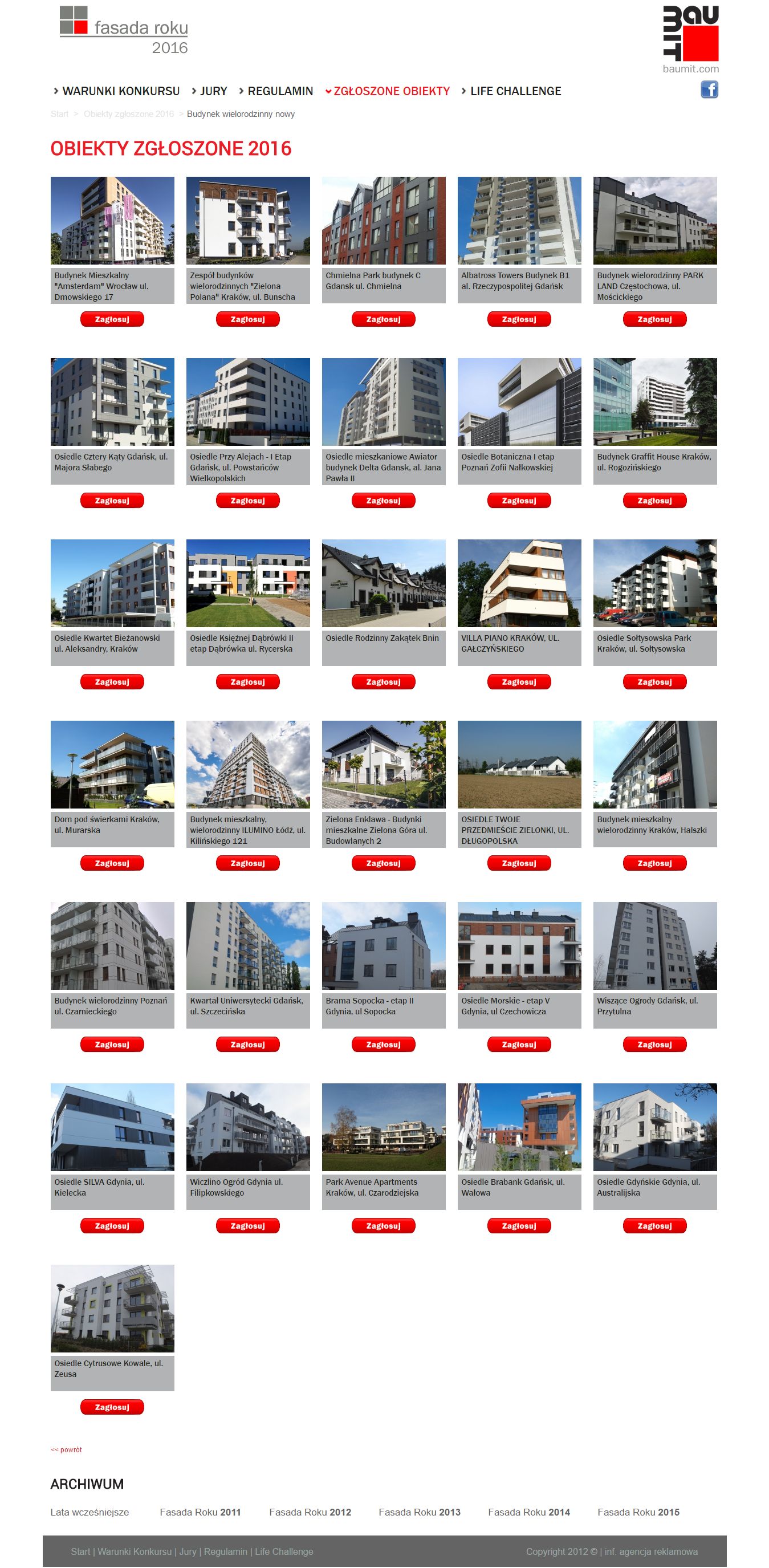 Sylwetki pretendentów do tytułu "Fasada Roku 2016" prezentowane są na stronie konkursu: www.fasadaroku.pl. Na pewno nie jest to ostateczna lista kandydatów z aspiracjami do zwycięstwa. Właściwie w obsadzie każdej kategorii można spodziewać się jeszcze wielu roszad - patrząc przez pryzmat poprzednich edycji, najwięcej kandydatur wysuwanych jest w ostatnich dniach regulaminowego czasu. Finalny skład grup wyklaruje się zatem po upływie terminu przewidzianego na zgłoszenia.