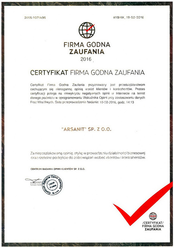 Certyfikat Firma Godna Zaufania dla firmy Arsanit