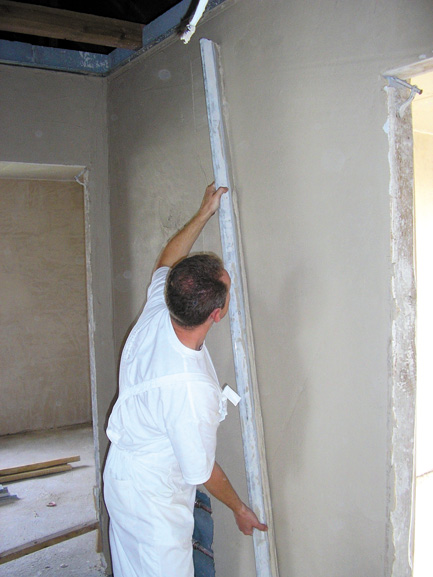 Do wstępnego wyrównania zaprawy używamy łaty tynkarskiej typu „H”, którą prowadzimy pod niewielkim katem w stosunku do podłoża. Po zaciągnięciu tynku dokonujemy pomiaru kontrolnego powierzchni przy pomocy poziomnicy. Jeżeli odchyłki od pionu lub nierówności płaszczyzny są zbyt duże, należy nałożyć odpowiednią ilość świeżej zaprawy.