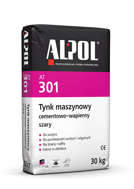 Mury z cegieł i pustaków ceramicznych, silikatowych, bloczków z betonu komórkowego oraz ściany i stropy z betonowych elementów prefabrykowanych. Stare, nie zwietrzałe tynki cementowo-wapienne, tynk podkładowy ALPOL AT 303. Przygotowanie podłoża: Podłoże musi być czyste, nośne, suche oraz wolne od zanieczyszczeń, pyłu i tłustych plam. Stare i mocne tynki oczyścić z warstw malar-skich, szczeliny poszerzyć, ubytki i nierówności uzupełnić zaprawą szybkowiążącą ALPOL AZ 130 lub wyrównawczą ALPOL AZ 135. Słabe tynki wzmocnić gruntem głęboko penetrującym ALPOL AG 700, bardzo nasiąkliwe gruntem do chłonnych podłoży ALPOL AG 703 lub wykonać obrzutkę wstępną tynkiem ALPOL AT 303. Ściany z betonu komórkowego oraz z cegieł i bloczków silikatowych nie wymagają wcześniejszego zagruntowania jak również wykonania obrzutki wstępnej. Przed narzuceniem tynku należy je obficie zmoczyć wodą. Na innych podłożach wykonać obrzutkę wstępną tynkiem podkładowym ALPOL AT 303 lub zastosować grunt ALPOL AG 702. Miejsca narażone na powstawanie rys, na przykład sąsiadujące z sobą różne materiały konstrukcyjne, naroża otworów budowlanych itp. należy wzmocnić siatką zbrojącą z włókna szklanego o oczkach 10 mm, zatapiając ją w zaprawie szybkowiążącej ALPOL AZ 130 lub wyrównawczej ALPOL AZ 135. Dane techniczne tynku AT 301: