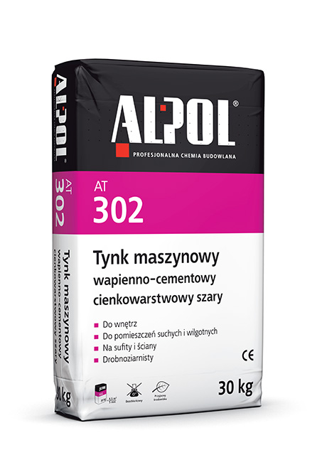 Tynki ALPOL wykonane jako podkładowe oraz ściany i stropy z betonowych elementów prefabrykowanych. Przygotowanie podłoża: Podłoże z betonu prefabrykowanego i szalunków systemowych musi być czyste, nośne, suche oraz wolne od zanieczyszczeń, pyłu i tłustych plam. Aby stworzyć warstwę sczepną należy je pomalować gruntem ALPOL AG 702. Przy nakładaniu tynku ALPOL AT 302 na podłoża ze świeżych tynków cementowo-wapiennych, np. ALPOL AT 300, ALPOL AT 301, ALPOL AT 303 należy zachować przerwę technologiczną minimum 7 dni na każdy centymetr grubości tynku. Następnie podłoże pomalować gruntem ALPOL AG 702 lub obficie zmoczyć wodą. Miejsca narażone na powstawanie rys, na przykład sąsiadujące z sobą różne materiały konstrukcyjne, naroża otworów budowlanych itp. należy wzmocnić siatką zbrojącą z włókna szklanego o oczkach 10 mm, zatapiając ją w zaprawie szybkowiążącej AL-POL AZ 130 lub wyrównawczej ALPOL AZ 135. Dane techniczne tynku AT 302: