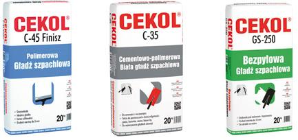 W skład pełnego systemu wchodzą zatem: grunty tynkarskie, tynki, gipsy szpachlowe, produkty do suchej zabudowy jak kleje oraz masy do spoinowania, a także gładzie. Cekol oferuje zarówno gładzie gotowe, które dostarczone są w postaci gotowego produktu, niewymagające wcześniejszego przygotowania jak: Biała gładź szpachlowa Cekol A-45 Finisz czy Gładź szpachlowa Cekol C-45 Finisz oraz produkty sypkie, jak sztandarowa Biała gładź szpachlowa Cekol C-44 oraz gładź finiszowa Cekol C-45 Finisz oraz produkt do zadań specjalnych, do pomieszczeń o podwyższonej wilgotności Cekol C-35 Cementowo polimerowa biała gładź szpachlowa. Innowacyjnym i wygodnym rozwiązaniem jest zastosowanie produktów do obróbki na mokro tj. Cekol F-16 Bezpyłowa gładź szpachlowa gotowa czy Cekol GS-250 Bezpyłowa gładź szpachlowa.